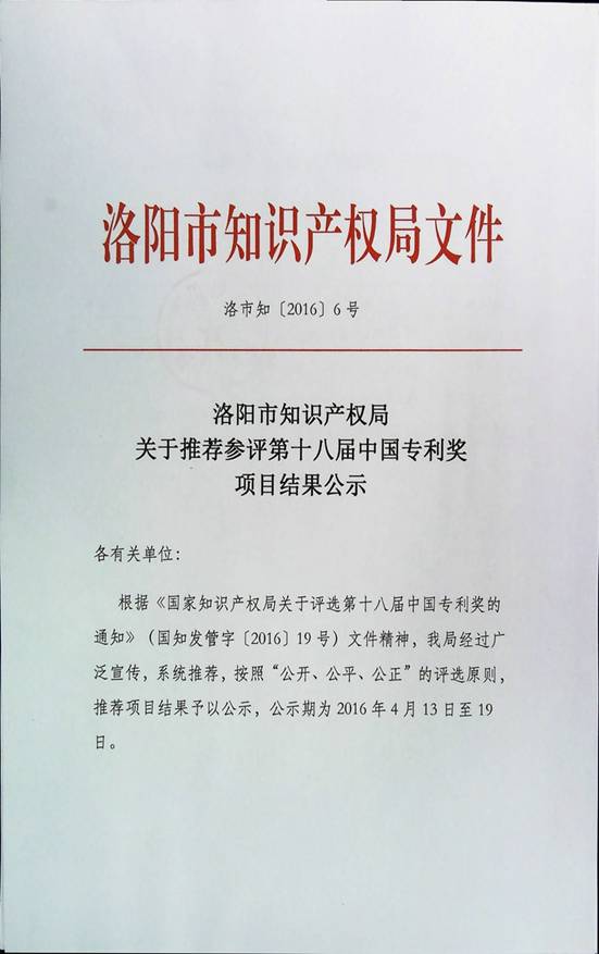 中國***獎每年評選一次,今年為第十八屆。公司上述***契合了當前大氣污染和霧霾治理的環(huán)境熱點問題,在眾多參評***中脫穎而出,被高新區(qū)和洛陽市推薦給了國家知識產權局參加本屆中國***獎的評選,這是公司***管理工作中的一件具有標志性意義的事件。